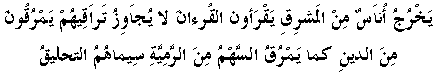 which means: <<There will be people who come from the eastern side of Arabia who will recite Qur’an, but their recitation will not pass beyond their collarbones{28}. They will go out of Islam as swiftly as the arrow goes through the prey. Their sign is shaving their heads.>> This hadith was mentioned in many narrations, including Sahih-ul-Bukhariyy and other books of hadith. There is no need to expound on listing these narrations or their narrators because they are well-known and of the sahih{29} classification.