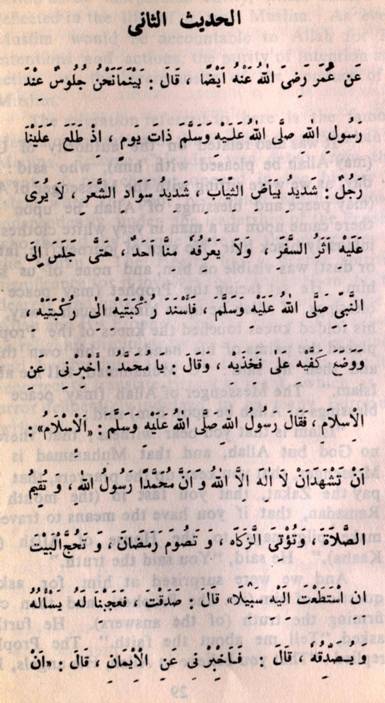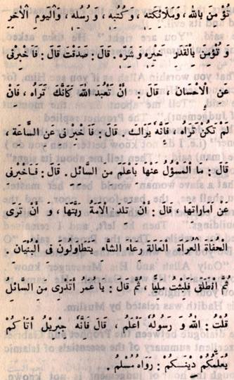 "Narrates Hadhrat Umar that one day we (the Companions) were in the audience of the Prophet when a man suddenly appeared before us. His raiments were milky white and hair jet black. He bore no signs of a journey so that he could be taken for a wayfarer. And none of us had seen him before. He went fore and sat directly in front of the Prophet in a manner that his knees touched those of the Prophet. Placing his hand on the Prophet's thighs, he said, "0 Muhammad! Inform me what Islam is". The Prophet replied "Islam means that you affirm and recite (with sincerity and conviction) 'there is no God (worthy of worship and obedience) save one God, and Muhammad is His Apostle'; establish Namaz, fast during the month of Ramadhan, pay Zakat and, if in possession of means and material resources, undertake to perform Hajj) (Pilgrimage to Mecca)". The seeker heard and confirmed the reply as absolutely correct. Hadhrat Umar goes on: "We were amazed that the gentleman was asking the question and at the same time affirming the answers". Then he asked what Iman was. The Prophet replied "(Iman is that you consciously accept with full conviction the existence of God, His angels, His Books, His apostles, the establishment of Day of Judgment and that all good and bad is by His Command". The seeker again asserted the truth. (Translator)