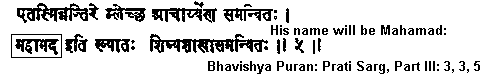 “A malechha (belonging to a foreign country and speaking foreign language) spiritual teacher will appear with his companions. His name will be Mahamad. Raja (Bhoj) after giving this Mahadev Arab (of angelic disposition) a bath in the 'Panchgavya' and the Ganges water, (i.e. purging him of all sins) offered him the presents of his sincere devotion and showing him all reverence said, 'I make obeisance to thee.' 'O Ye! the pride of mankind, the dweller in Arabia, Ye have collected a great force to kill the Devil and you yourself have been protected from the malechha opponents (idol worshipers, pagans).' ‘O Ye! the image of the Most Pious God the biggest Lord, I am a slave to thee, take me as one lying on thy feet.'“The Malechhas have spoiled the well-known land of the Arabs. Arya Dharma is not to be found in that country. Before also there appeared a misguided fiend whom I had killed [note: e.g., Abraha Al-Ashram, the Abyssinian viceroy of Yemen, who attacked Mecca]; he has now again appeared being sent by a powerful enemy. To show these enemies the right path and to give them guidance the well-known Mahamad (Mohammad), who has been given by me the epithet of Brahma is busy in bringing the Pishachas to the right path. O Raja! You need not go to the land of the foolish Pishachas, you will be purified through my kindness even where you are. At night, he of the angelic disposition, the shrewd man, in the guise of a Pishacha said to Raja Bhoj, "O Raja! Your Arya Dharma has been made to prevail over all religions, but according to the commandments of ‘Ashwar Parmatma (God, Supreme Spirit), I shall enforce the strong creed of the meat-eaters. My follower will be a man circumcised, without a tail (on his head), keeping beard, creating a revolution, announcing call for prayer and will be eating all lawful things. He will eat all sorts of animals except swine. They will not seek purification from the holy shrubs, but will be purified through warfare. Because of their fighting the irreligious nations, they will be known as Musalmans (Muslims). I shall be the originator of this religion of the meat-eating nation."